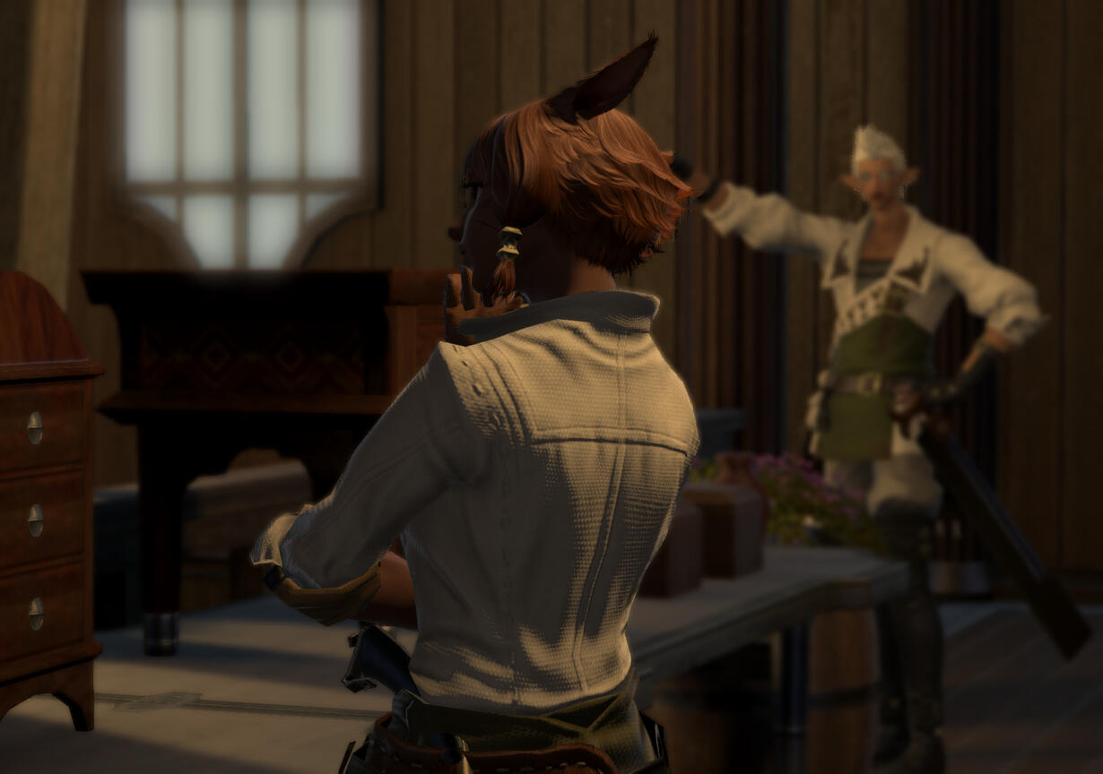 "What if you didn’t lose your memory? What if something in Etheirys came and stored it all away. For you to slowly open one box at a time. So you can choose which parts to keep. Keep almost none of it. Only the flowers on the windowsill. Only the distant sound of a radio. Lose all the actors, the dark shadows, leave only the still lifes, the blissful distant wash of waves. If everybody knew -- you never did. She’ll be coming soon. That is all."